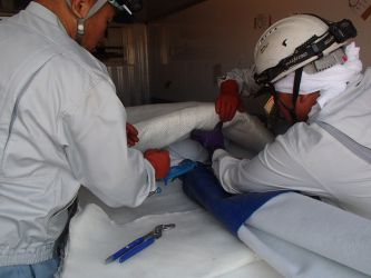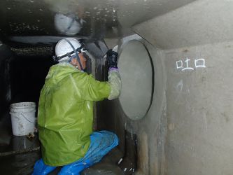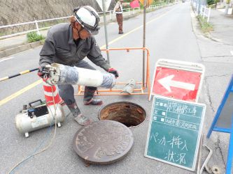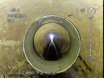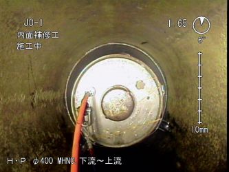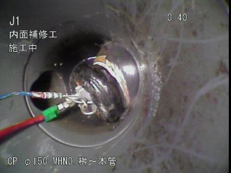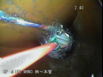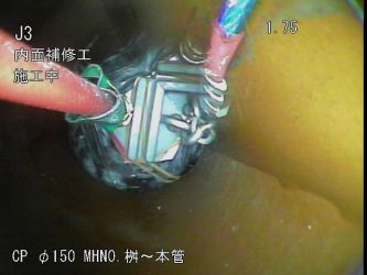 損傷した管渠の内面にFRPライニングを行う、非開削の工法です。ガラス繊維マットに樹脂を含侵させて補修機に巻き付け、空気圧で圧着させて樹脂を硬化させるもので、止水と補強を実現します。